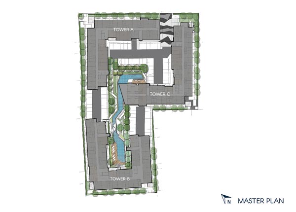 ทางโครงการออกแบบอาคารพักอาศัยโอบล้อมพื้นที่ส่วนกลางและสระว่ายน้ำขนาดใหญ่ ให้ความรู้สึกร่มรื่น นอกจากนี้ยังจัดสิ่งอำนวยความสะดวกกระจายอยู่ในแต่ละอาคารอีกด้วย ซึ่งแต่ละอาคารก็จะมีข้อดีแตกต่างกันไป โดยอาคาร A จะอยู่ใกล้ทางเข้าออก สะดวกไม่ต้องเดินไกล, อาคาร B เป็นส่วนตัวมากที่สุดเพราะอยู่ด้านในสุด และใกล้สระว่ายน้ำ ได้วิวสระแบบเต็มๆ และอาคาร C เป็นอาคารที่รวมสิ่งอำนวยความสะดวกไว้เยอะที่สุดสามารถเดินมาใช้บริการได้สะดวก ทั้ง Co-Working Space, Shop ร้านค้า 2 ยูนิต , ห้องฟิตเนส และห้องอ่านหนังสือ นอกจากนี้บนดาดฟ้าของแต่ละอาคารยังมีพื้นที่สีเขียวอีกด้วย
