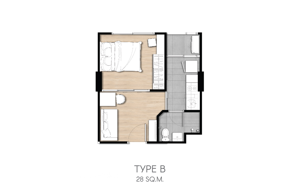 - แบบ 1 Bedroom (Type B) : พื้นที่ใช้สอยขนาด 28 ตร.ม. (คลิกชมแปลนห้อง)