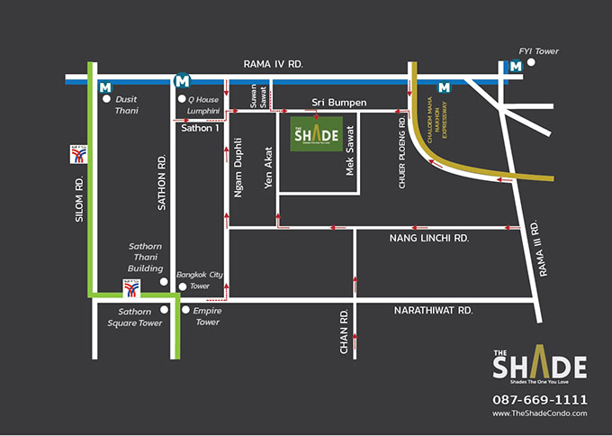 หากเดินทางด้วยรถไฟฟ้าใต้ดิน จะเห็นได้ว่าระยะทางจาก MRT ลุมพินี ไปยังโครงการ The Shade Sathon 1 มีระยะทางเพียงแค่ 1.5 กิโลเมตร เท่านั้น สามารถเข้า-ออก ได้หลายเส้นทาง ทั้งซอยสาทร 1