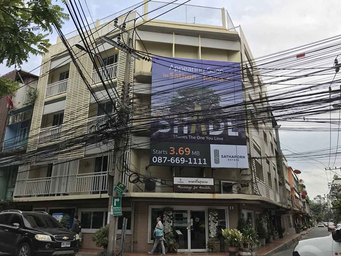 ก่อนถึงโครงการฯ ไม่ไกล ก็จะเจอสามแยกที่มีบิลบอร์ดของโครงการ The Shade Sathon 1 ติดอยู่บนอาคารพาณิชย์ทั้งสองฝั่ง ป้ายมีขนาดใหญ่และอยู่ตรงแยกพอดีทำให้คนที่ผ่านไปมามองเห็นได้อย่างชัดเจน