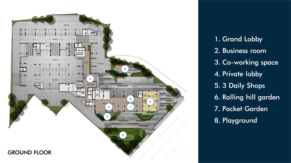 Floor Plan ชั้น Ground : ประกอบด้วยสิ่งอำนวยความสะดวก และพื้นที่จอดรถ