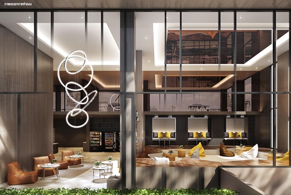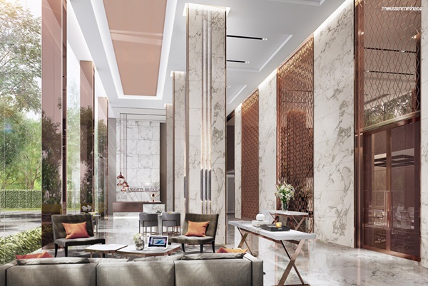 ภาพจำลองบรรยากาศ Grand Lobby แบบ Double Volume เพดานสูง 7 เมตร ตกแต่งในสไตล์ Modern Luxury