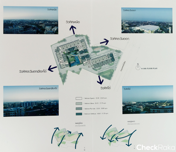 - ทิศใต้ : ติดกับคอนโดสูง 15 ชั้น แต่ทางโครงการออกแบบผังอาคารเบี่ยงกับโครงการเพื่อนบ้านไม่บังวิวกันแบบตรงๆ