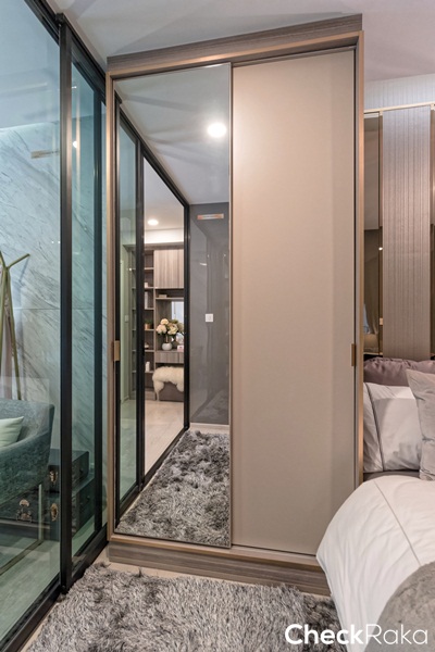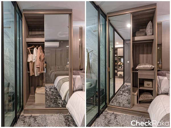 หน้าบานฝั่งหนึ่งเป็นบานทึบโทนสี Pink Gold นิดๆ และอีกฝั่งเป็นกระจกเงาบานใหญ่เต็มบาน