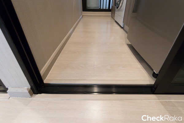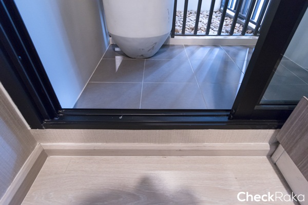 ประตูระเบียงเป็นบานเลื่อน 2 ตอน เปิดจากซ้ายไปขวา กรอบอลูมิเนียมสีดำ อยู่ติดกับเคาน์เตอร์ครัว