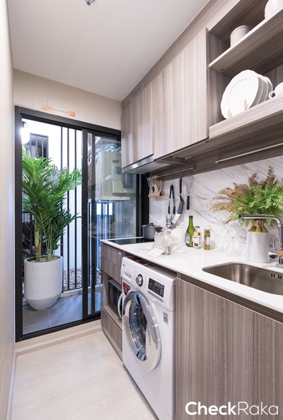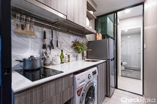 ตำแหน่งเครื่องซักผ้า และไมโครเวฟวางไว้ใต้เคาน์เตอร์ครัว วางเครื่องซักผ้าแบบฝาหน้าขนาด 8 กิโลกรัม