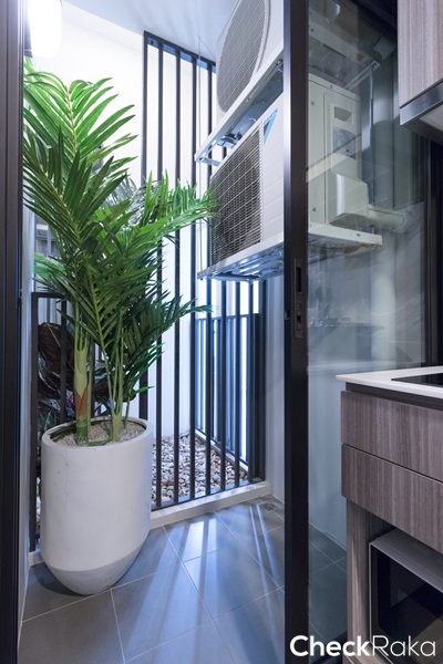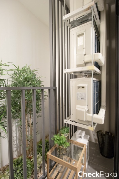 คอมเพรสเซอร์ยกลอยไว้ที่ผนังฝั่งขวาของระเบียงทำให้สามารถใช้พื้นที่ตรงระเบียงได้อย่างเต็มพื้นที่