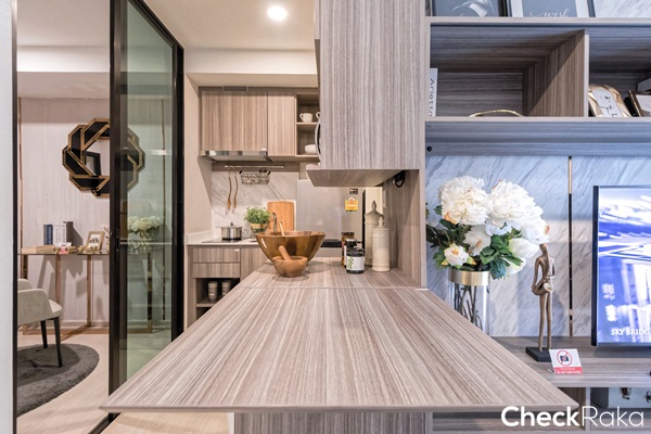 ระหว่างห้องครัวกับห้องน้ำทางโครงการออกแบบเป็นพื้นที่สำหรับวางโต๊ะทำงาน