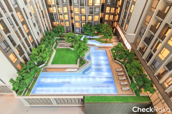 โมเดลจำลองสระว่ายน้ำบนชั้น 4 พร้อมพื้นที่ Sun bed แบบ Semi-outdoor