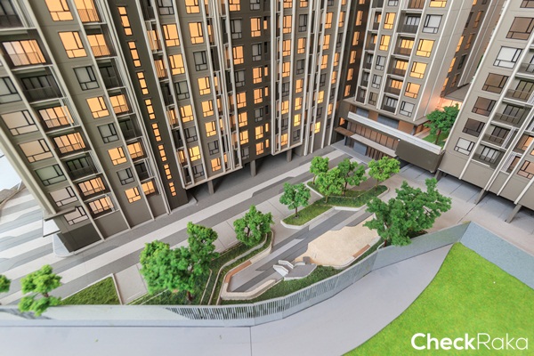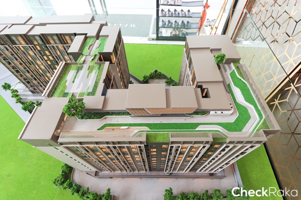 โมเดลจำลองอาคารด้านหลังฝั่งทิศตะวันตก จะติดกับบ้านพักอาศัยสูง 1-2 ชั้น และคอนโดสูง 8 ชั้น