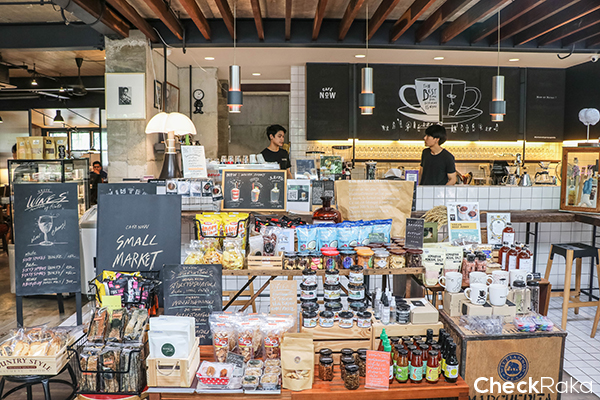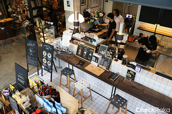 โซนเคาน์เตอร์บาร์ที่ปูด้วยกระเบื้องสีขาวตัดกับโต๊ะไม้ สามารถมานั่งพูดคุยกับบาริสต้าได้