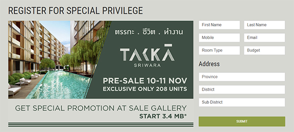อย่างที่กล่าวไว้แล้วว่าในย่านนี้ไม่มีคอนโดมา 10 ปีแล้ว Takka Sriwara ถือเป็น 1 เดียวในย่านทาวน์อินทาวน์ ที่เข้ามาตอบโจทย์ของคนทำงานแถวนี้ ซึ่งจะช่วยให้ชีวิตง่ายขึ้น ไม่ต้องทนรถติดเพื่อไปทำงาน อีกทั้งยังสะดวกทั้งในด้านอาหาร ร้านค้าต่างๆ ก็มีครบ และถ้าใครติดเมืองหน่อยก็สามารถเดินทางได้สะดวกด้วยระยะทางที่ไม่ไกล ท่านที่สนใจสามารถลงทะเบียนเพื่อรับสิทธิพิเศษได้ที่ลิงก์ด้านล่างนี้ค่ะ