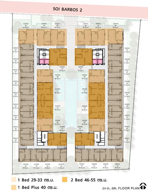- วิวสระว่ายน้ำด้านในทั้งหมดจะเป็นห้องใหญ่แบบ 1 ห้องนอน ขนาด 40 ตร.ม. และแบบ 2 ห้องนอน ขนาด 46 ตร.ม. และ 55 ตร.ม.