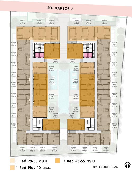 Floor Plan ชั้น 8 : คล้ายกับชั้น 3-7 คือเป็นห้องพักอาศัยทั้งหมด จะแตกต่างกันนิดหน่อยตรงที่ห้องหัวมุมฝั่งทิศใต้ปรับขนาดให้ใหญ่ขึ้นจาก 29 ตร.ม. เป็นขนาด 33 ตร.ม. และหน้าต่างของห้องพักอาศัยบนชั้น 8 ทุกห้องเป็นแบบ Double Full Screen (หน้าต่าง 2 ชั้น คือทำเป็นกระจกเพิ่มขึ้นมาอีก 1 ชั้น สามารถเปิดเพื่อทำเป็น Outdoor หรือจะปิดเพื่อเป็นพื้นที่แบบ Indoor เป็นการเพิ่มพื้นที่พักอาศัยในห้องให้กว้างมากยิ่งขึ้น)