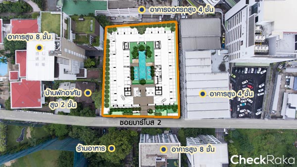 โซนด้านหน้าจะติดกับบ้านพักอาศัยความสูง 2 ชั้น ส่วนโซนด้านหลังจะติดกับอาคารพักอาศัยความสูงประมาณ 8 ชั้น