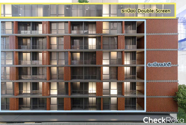 โมเดลจำลองลักษณะระเบียงแบบปกติของห้องพักอาศัยชั้น 2-7 และระเบียงแบบ Double Screen บนชั้น 8