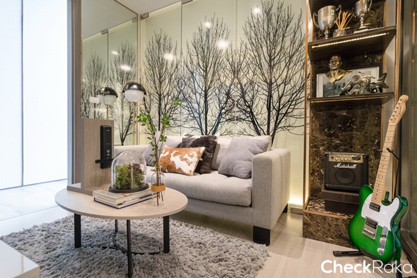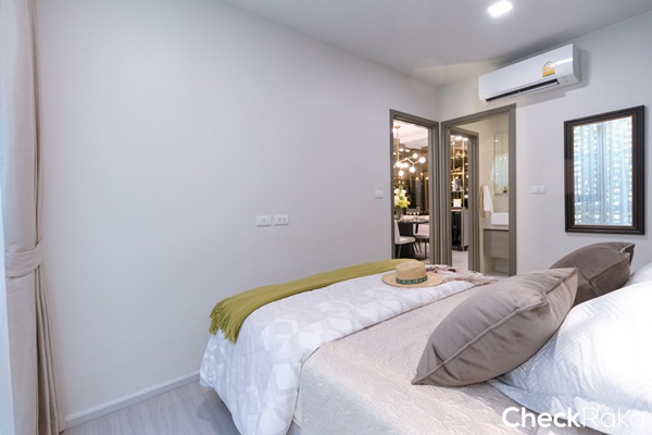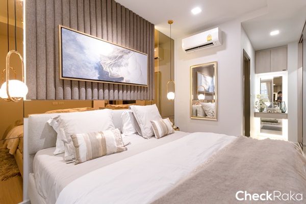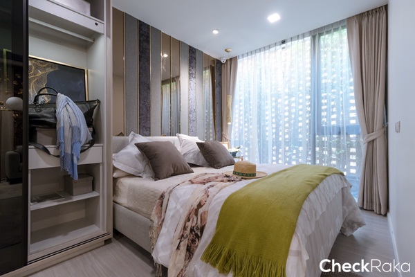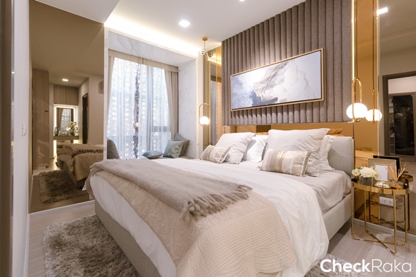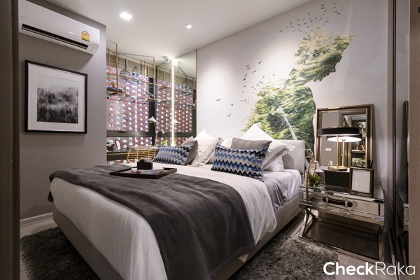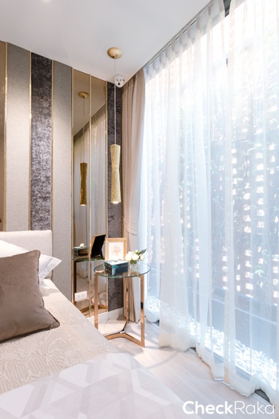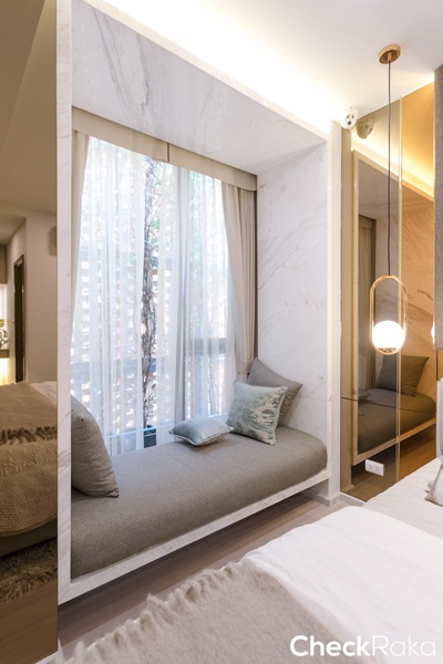 พื้นที่ริมหน้าต่างห้องนี้ทางโครงการวางโซฟาเบดมาให้ดูเป็นไอเดีย ถือเป็นการเพิ่มมุมพักผ่อนให้ให้กลับห้องนอนได้ดี