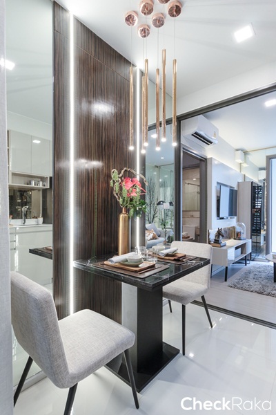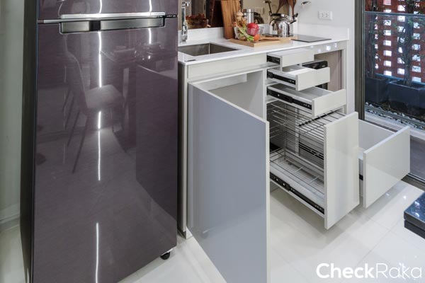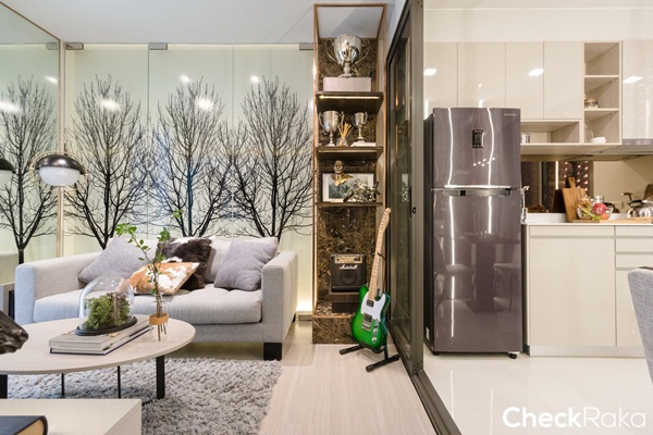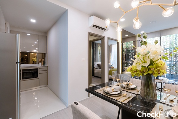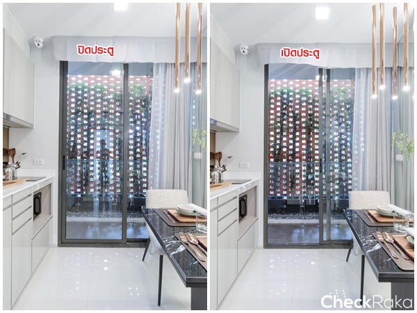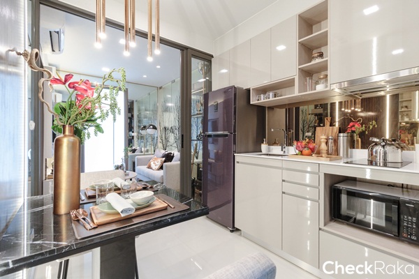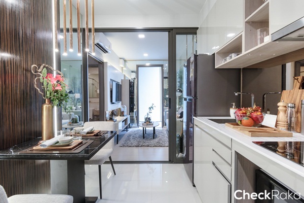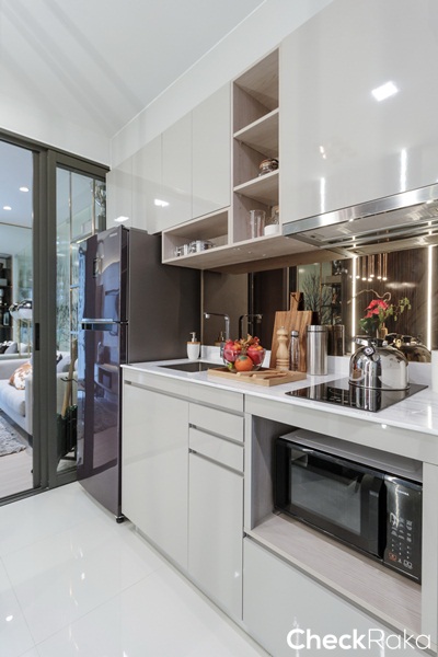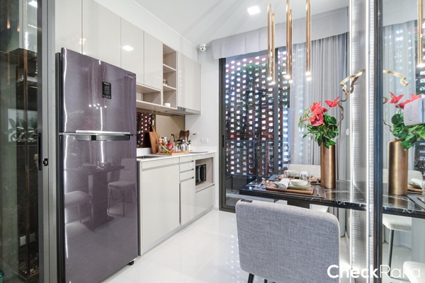 ยังคงได้เป็นครัวเปิด ได้เคาน์เตอร์ครัวรูปตัว L ได้พื้นที่เตรียมอาหาร และช่องสำหรับเก็บของเยอะขึ้นกว่าห้องที่แล้ว