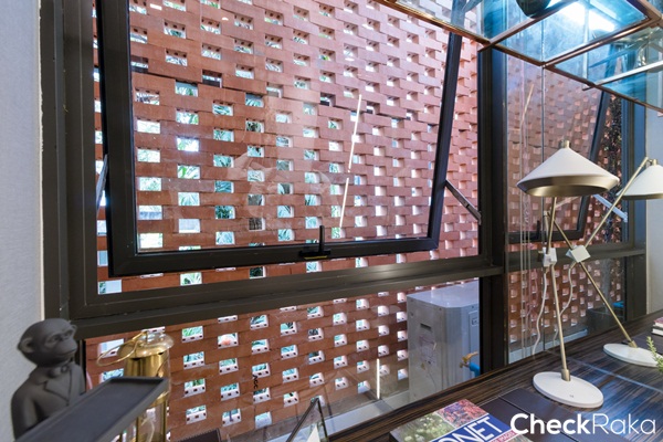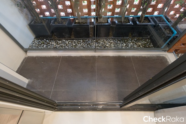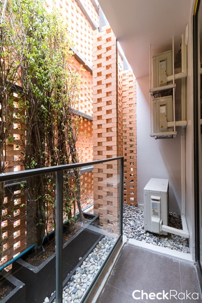คอมเพรสเซอร์แอร์อยู่ทางขวาของระเบียง ติดตั้งที่บังสายตาไว้ให้เช่นเคย