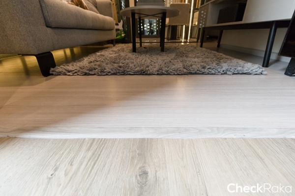พื้นห้องนอนปูด้วยไม้ลามิเนตหนา 8 มม. แบบเดียวกับห้องนั่งเล่น