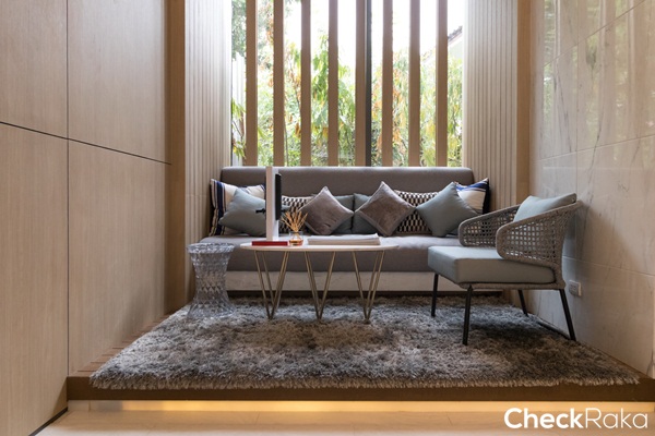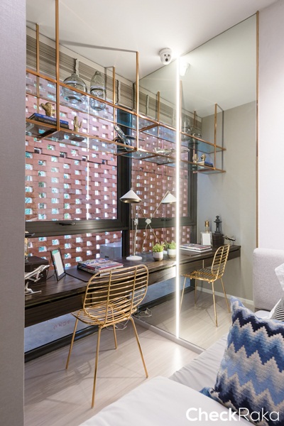 มุมโซฟาโต๊ะทำงานริมหน้าต่างไม่มีให้นะคะ ทางโครงการเพียงตกแต่งมาให้ดูเป็นไอเดียเท่านั้น