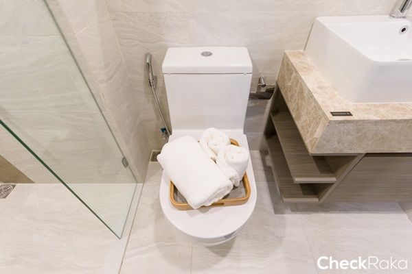 สุขภัณฑ์ในห้องน้ำของ Kasch ฟังก์ชันการใช้งานครบเหมือนห้องที่แล้ว แต่ห้องนี้จะมีความพิเศษกว่าห้องอื่นตรงที่เดินระบบสำหรับติดตั้งเครื่องทำน้ำร้อนมาให้ พร้อมได้ Rain Shower ทรงสี่เหลี่ยมขนาดใหญ่