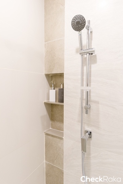 ในโซนอาบน้ำห้องน้ไม่ได้เจาะผนังสำหรับวางอุปกรณ์อาบน้ำเหมือห้องที่แล้ว แต่ติดตั้งที่วางสบู่มาให้แทน