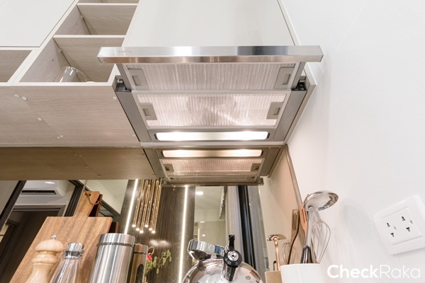 ห้องนี้ได้เตาไฟฟ้า 4 หัว ระยะทำครัวจากเคาน์เตอร์ครัวถึงผนังกว้างประมาณ 100 ซม.