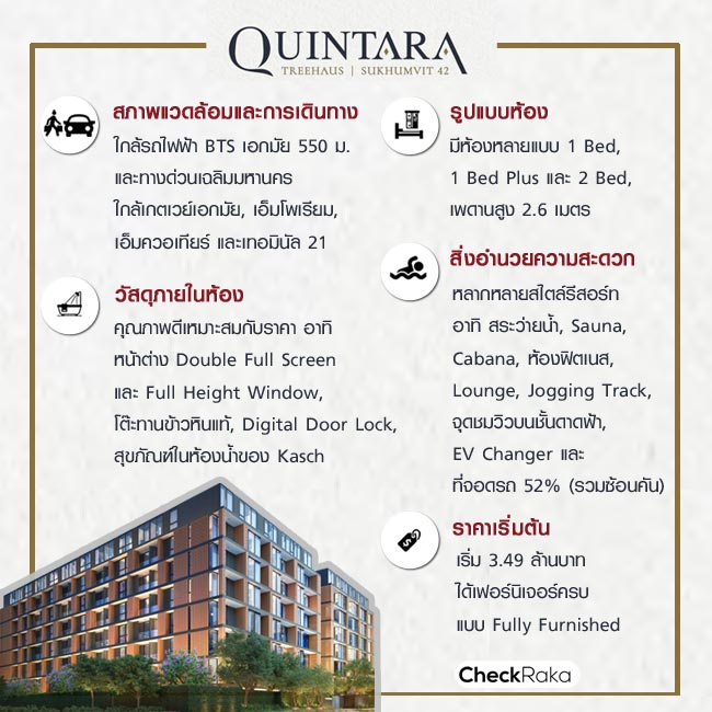 รอบนี้เราจะพาทุกคนไปรีวิวเยี่ยมชมคอนโดมิเนียม Low-rise โครงการใหม่ ควินทารา ทรีเฮาส์ สุขุมวิท 42 (Quintara Treehaus Sukhumvit 42) จากบริษัท อีสเทอร์น สตาร์ เรียล เอสเตท ที่ส่วนใหญ่จะทำโครงการระดับ Luxury หน่อย โดยโครงการนี้มาพร้อมคอนเซปต์ กับการใช้ชีวิต ใกล้ชิดธรรมชาติ ในความเป็นส่วนตัวใจกลางเมือง บนทำเลใกล้รถไฟฟ้า BTS สถานีเอกมัย เพียง 550 เมตร เท่านั้น พร้อมสิ่งอำนวยความสะดวกดีไซน์เหนือระดับคุณภาพเทียบเท่าโครงการ High-rise จะสวยแปลกตาและมีความน่าสนใจขนาดไปตามไปชมกันเลยค่ะ