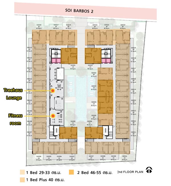 Floor Plan ชั้น 2 : เป็นชั้นที่มีห้องพักอาศัย และสิ่งอำนวยความสะดวก อาทิ Treehaus Lounge และ Fitness Room ออกแบบมาแยกส่วนพื้นที่พักอาศัยกับพื้นที่ส่วนกลางออกจากกันเป็นสัดส่วน อาคาร A มีห้องพักอาศัยจำนวน 18 ยูนิต และอาคาร B มี 22 ยูนิต