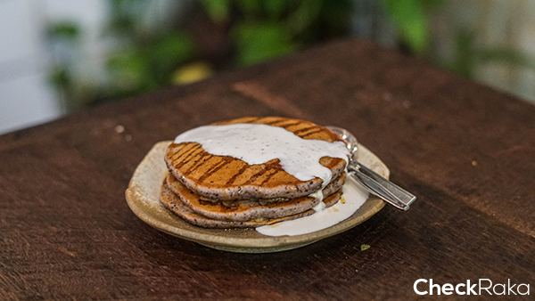 แพนเค้กข้าวหอมนิลจากสุรินทร์ ทีเด็ดอยู่ที่ซอสกล้วยปิ้งที่ราดอยู่ด้านบน หอมหวานลงตัวสุดๆ