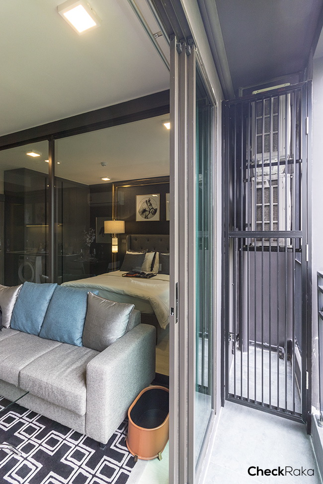 ระเบียงอยู่ถัดจากห้องนั่งเล่น สามารถเปิดออกไปรับลมชมวิวได้ชิลๆ