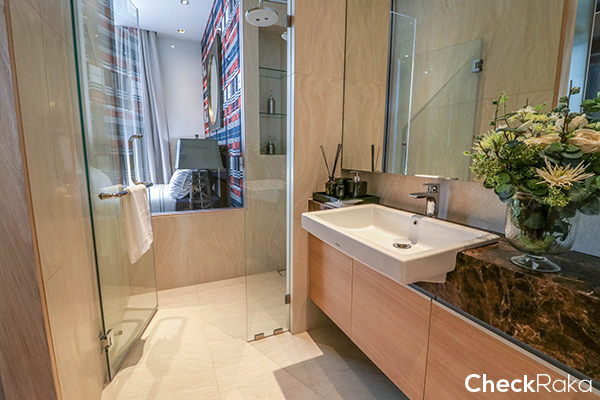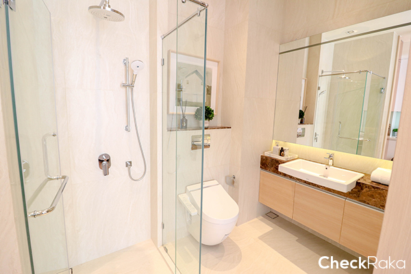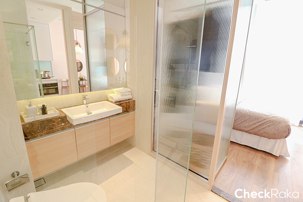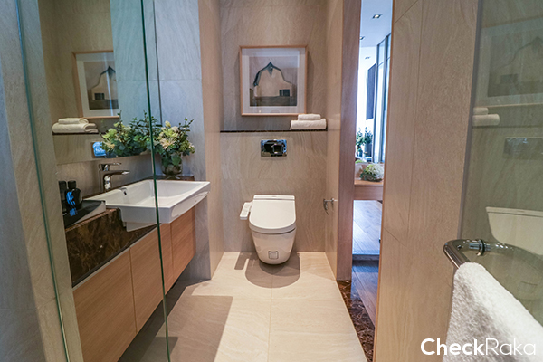 ตรงข้ามกับครัวจะเป็นทางเข้าห้องน้ำ ชั้นวางหลังโถสุขภัณฑ์อัตโนมัติ และตรงอ่างล้างหน้าจะเป็นหินอ่อนแท้