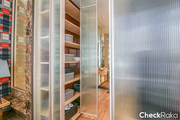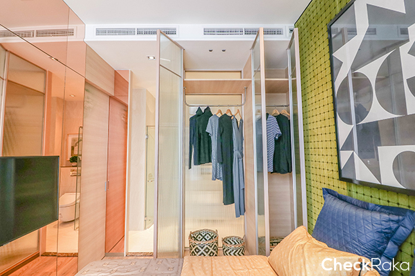 ตู้เก็บของและตู้เสื้อผ้าบิวท์อินที่โครงการออกแบบมาให้ ผิวหน้าบานเป็น "อะคริลิคลอน" กรอบเป็นอะลูมิเนียม สี Pink Gold