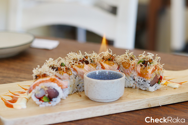Hell Salmon Maki มีลูกเล่นด้วยเสิร์ฟพร้อมไฟกลางจาน