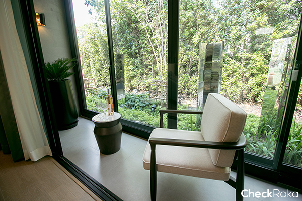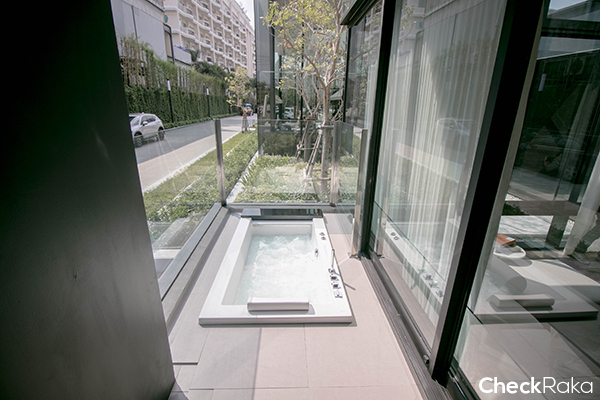 เปิดตูออกไปที่ระเบียงชั้น 1 จะมีอ่าง jacuzzi ให้ และทั้งโครงการระบบแอร์จะเป็นแบบ VRF Aircondition