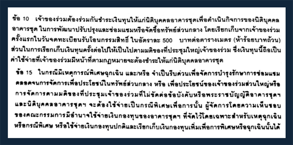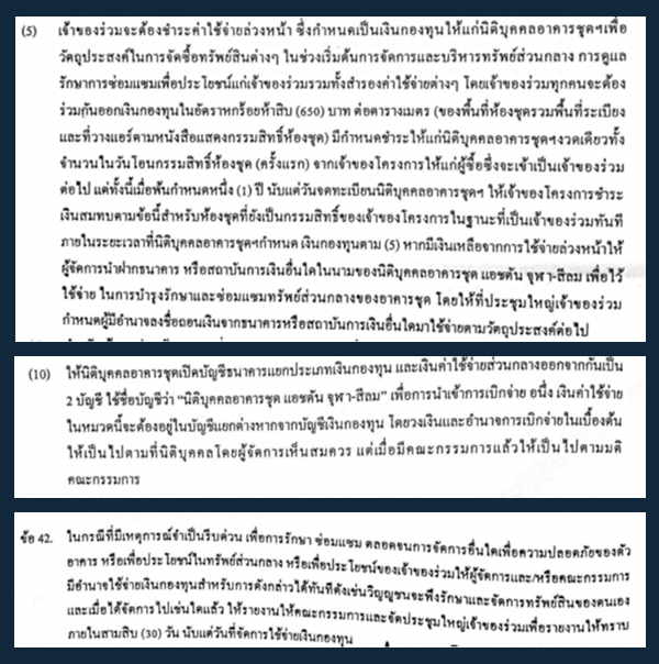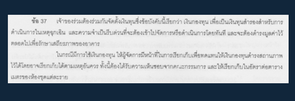 ตัวอย่างเรื่องการใช้ "เงินกองทุน" ในข้อบังคับของคอนโดแห่งหนึ่งบนถนนพหลโยธิน