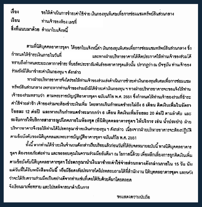 การเรียกเก็บ "เงินกองทุนพิเศษเพื่อการซ่อมแซมทรัพย์สินส่วนกลาง"