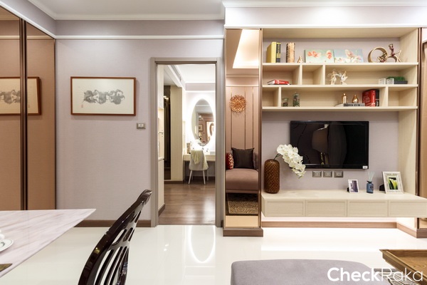 หรือจะ Built-in เป็นชั้นวางทีวีบริเวณปลายเตียง เพื่อเป็นตู้สำหรับเก็บของก็ได้เช่นกัน