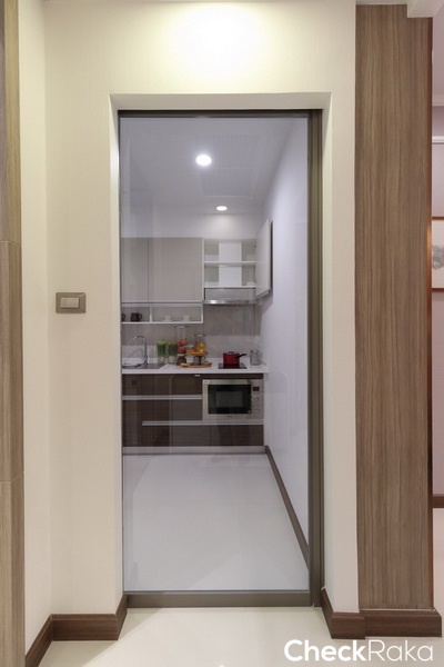 ถัดมาเป็นห้องครัวแบบครัวปิด แต่ลักษณะ Layout ของห้อง Type นี้จะเป็นแนวยาวลึกกว่าห้องที่แล้ว เหมาะสำหรับผู้ที่ชื่นชอบการทำอาหารหนักๆ สามารถเปิดประตูที่ระเบียงเพื่อช่วยระบายกลิ่นระหว่างทำอาหารได้