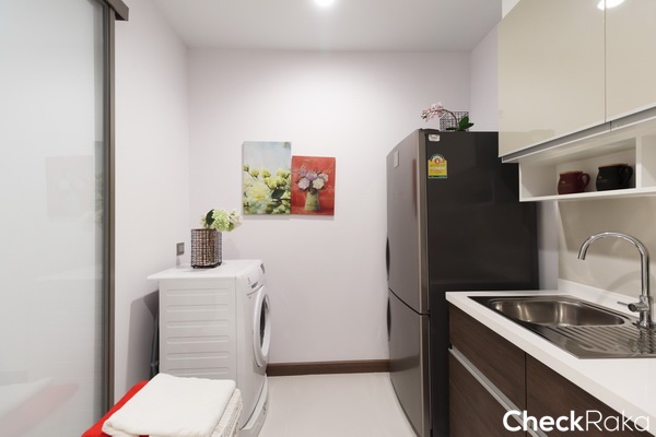 ถัดมาเป็นพื้นที่วางตู้เย็น พื้นที่วางเครื่องซักผ้า และประตูระเบียงแบบกระจกบานเลื่อน 2 ตอน