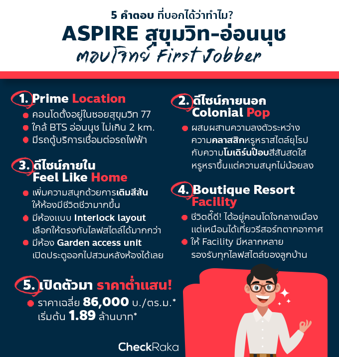 ทำเลที่เค้าเรียกกันว่า Prime Location เท่าที่นึกขึ้นได้ก็มี โซนทองหล่อ, เพลินจิต, ชิดลม, สีลม, สาทร, พญาไท, อโศก, พระราม 9 โดยเฉพาะ สุขุมวิท (ตอนต้น) โซนที่กล่าวมามีทั้งที่เป็นและกำลังจะเป็น CBD แน่นอนว่าราคาเฉลี่ยพุ่งเกินแสนบาทต่อตารางเมตรแน่ๆ ขยับออกมาโซน รัชดา-ลาดพร้าว, โซนเอกมัย และโซนอ่อนนุช ก็ยังเป็นโซนอยู่อาศัยยอดฮิตที่มีคอนโดกระจายตัวอยู่เยอะมาก ราคาจะต่ำจากโซน CBD ข้างต้น แต่บางโครงการก็ขยับขึ้นเป็นแสนบาทต่อตารางเมตรเช่นกัน สำหรับชาว First Jobber ที่น่าจะต้องการอยู่คอนโดราคาเบาๆ ใกล้ที่ทำงาน เดินทางสะดวก ที่จะบอกคือ Aspire สุขุมวิท-อ่อนนุช เป็นคอนโดราคาต่ำแสน ทำเล Prime Location ที่ชาว First Jobber ไม่ควรพลาด!! มีน้อยมากที่ราคาจะลงมาต่ำกว่าแสน แต่ก็ใช่ว่าจะไม่มีเลย อย่างที่บอก AP ทำ ASPIRE ทำเล สุขุมวิท-อ่อนนุช ออกมาในราคาต่ำแสน เฉลี่ยเริ่มต้น 86,000 บาท/ตร.ม.* ที่ตั้งโครงการห่างจาก BTS อ่อนนุช ประมาณ 2 กม. โครงการมีรถตู้รับส่งไว้บริการ และก็มีรถสองแถววิ่งผ่านถนนสุขุมวิท 77 ตลอดทั้งวัน หรือจะนั่งวินเข้าออกโครงการก็ประมาณ 20-30 บาท