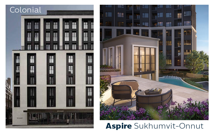 ASPIRE ที่ผ่านมา ถ้ามองแต่โครงการที่เป็น Low Rise ส่วนใหญ่จะเป็นตึกรูปแบบทั่วไป คล้ายๆ กันไปหมด แต่ "Aspire สุขุมวิท-อ่อนนุช" ถูกออกแบบให้เป็นคอนโด Low Rise สูง 8 ชั้น 3 อาคาร การออกแบบโครงสร้างภายนอกเป็นสไตล์ Colonial Pop ที่เป็นการผสมผสานความลงตัวระหว่างความคลาสสิกหรูหราสไตล์ยุโรปกับความโมเดิร์นป๊อบสีสันสดใส ซึ่งจริงๆ แล้ว Colonial เรียลๆ มักจะเป็นอาคารที่ใช้เสาทรงสูง ประตูและหน้าต่างจะเรียงตัวอย่างเป็นระเบียบในแนวเดียวกัน มักจะเป็นทรงสี่เหลี่ยม แล้วจะตกแต่งด้วยบัวที่เป็นปูนปั้น AP นำเอาดีไซน์ Colonial มาใช้กับ Aspire สุขุมวิท-อ่อนนุช ให้อาคารด้านนอกใช้โทนสีเทาเข้มสลับเทาอ่อน เรียงตัวโค้งรับกับโค้งน้ำ และโอบล้อม Clubhouse เอาไว้ ให้ความรู้สึกถึงความอบอุ่น ความหรูหรา และอิงกับย่านสุขุมวิท-อ่อนนุชได้อย่างลงตัว แต่ในขณะเดียวกันก็นำความ POP มาผสมผสานด้วยการเติมสีสันสดใสให้สิ่งอำนวยความสะดวกแต่ละจุด รวมถึงเติมสีสันเข้าไปในห้อง เหมือนทำให้เราได้หลุดเข้าไปอยู่ในรีสอร์ทตากอากาศทั้งที่อยู่ใจกลางเมือง