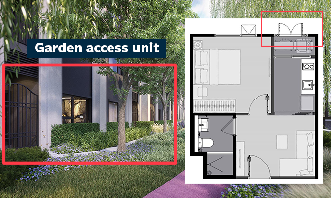 นอกจากนี้ยังมีห้องแบบ "Garden access unit" อยู่ชั้น 1 วางอยู่ติดกับ Backyard Garden และ Signature POP Track จะมีประตูเปิดออกไปยังส่วนกลางได้เลย ยิ่งให้ความรู้สึกเหมือนหลังบ้านมีสวนส่วนตัวไปอีก