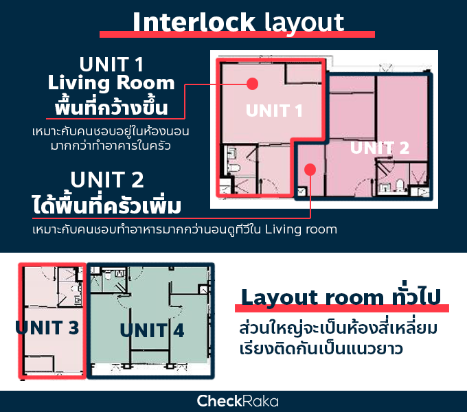 และที่น่าสนใจคือ คราวนี้ AP นำห้องแบบ "Interlock layout" มาใช้กับโครงการนี้ด้วย ก่อนหน้านี้เคยใช้กับ Life อโศก-พระราม 9 ซึ่งเป็นคอนโดแบรนด์ราคาสูงกว่า ASPIRE อยู่แล้ว ข้อดีห้องแบบนี้ให้อะไรมากกว่า layout สี่เหลี่ยมที่ใครๆ ก็ทำกัน คือเราสามารถเลือกได้ว่า เราอยากได้ห้อง living room กว้างๆ เพราะใช้ชีวิตส่วนใหญ่ไปกับการนอนดูซีรีส์ เราก็เลือก layout ที่ลดพื้นที่ครัวแล้วเพิ่มพื้นที่ living room (แบบ Unit 1) ส่วนคนที่มีความสุขกับการทำอาหารมากๆ อยากได้ครัวใหญ่ๆ เพราะใช้ชีวิตส่วนใหญ่อยู่กับการปรุงอาหาร ประมาณว่าเตรียมไปแข่งรายการมาสเตอร์เชฟ ก็ลดพื้นที่ living room ให้เล็กลงหน่อย แล้วจัดเต็มกับพื้นที่ครัว (แบบ Unit 2)