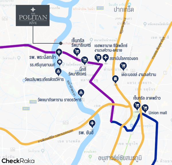 โครงการ เดอะ โพลิแทน รีฟ (The Politan Rive) ตั้งอยู่ ถนนนนทบุรี ซอยนนทบุรี 15 ตำบลบางกระสอ อำเภอเมืองนนทบุรี จังหวัดนนทบุรี 11000 ใกล้กับ MRT สายสีม่วงสถานีพระนั่งเกล้า