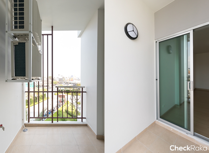 ระเบียงค่อนข้างกว้างและคอมเพรสเซอร์แอร์ก็แขวนไว้ ด้านบนมีกริลบังคับทิศทางลมให้ออกไปด้านข้างทำให้ไม่ร้อน