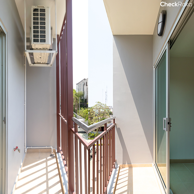 ออกมาที่ระเบียงคอมเพรสเซอร์แอร์จะแขวนไว้ที่ด้านบนพร้อมกริลบังเพื่อความสวยงาม