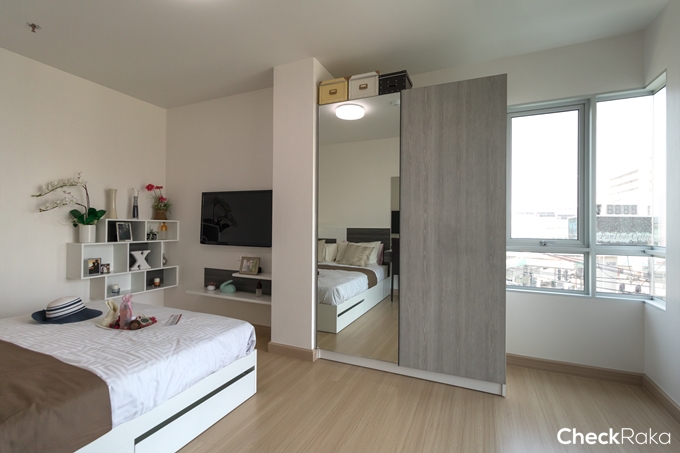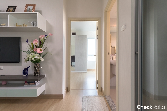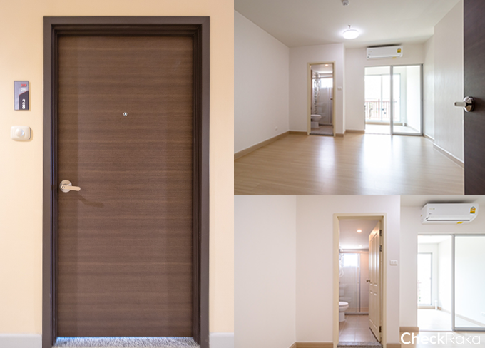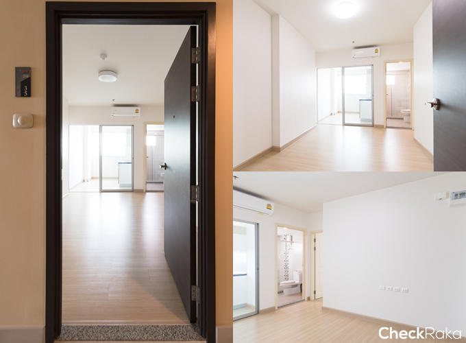 ทุกยูนิตของที่นี่จะมีกริ่งให้ด้วยนะคะ ห้องขนาด 39.5 ตร.ม. แต่วาง Layout ได้ดี ทำให้ห้องดูเป็นสัดส่วนและกว้างมาก