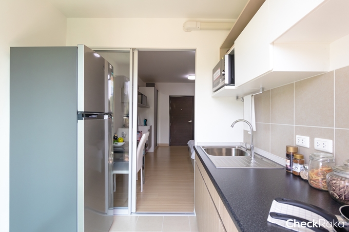 ห้องครัวแยกเป็นสัดส่วนกั้นด้วยประตูกระจกบานเลื่อนและเชื่อมต่อไประเบียง ทำให้ระบายอากาศได้ดีค่ะ